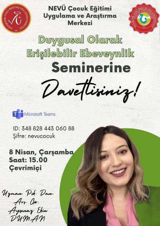 NEVÜ Çocuk Eğitimi Uygulama ve Araştırma Merkezi olarak, ebeveynlerin çocuklarıyla kurdukları duygusal bağları güçlendirmeye yönelik önemli bir seminere ev sahipliği yapıyoruz. Uzman Psikolojik Danışman Ayşenaz Ekin Duman tarafından verilecek olan “Duygusal Olarak Erişilebilir Ebeveynlik” konulu seminerde, çocukların duygusal ihtiyaçlarını anlama, sağlıklı iletişim kurma ve güvenli bağlanmayı destekleme konuları ele alınacaktır.